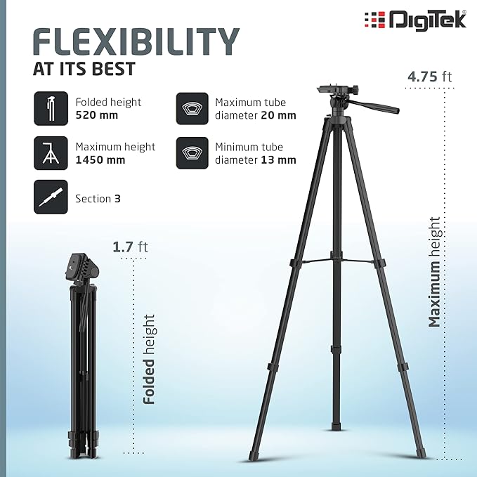 𝗧𝗛𝗥𝗘𝗘 𝗦𝗘𝗖𝗧𝗜𝗢𝗡 𝗔𝗗𝗝𝗨𝗦𝗧𝗠𝗘𝗡𝗧: With its three-section adjustable legs, you can customize the tripod’s height to suit your shooting requirements, ranging from a folded height of 1.7ft to a maximum height of 4.75ft.